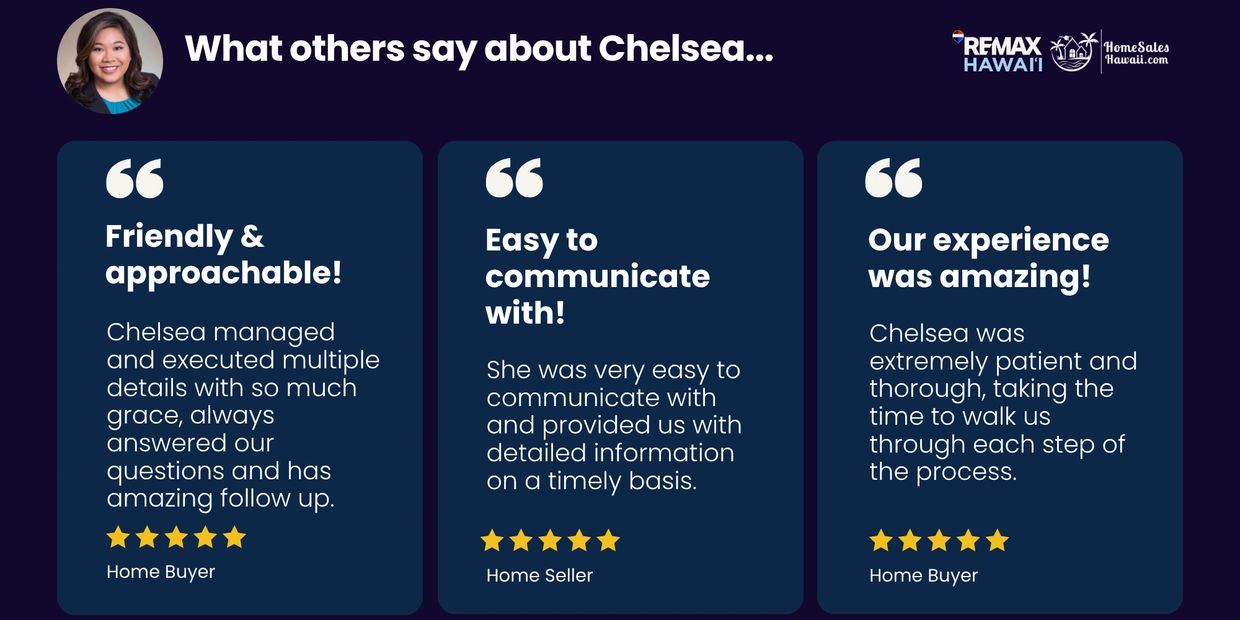 Chelsea was so patient, professional, timely in her responsiveness and communication, pays attention to detail, friendly and approachable. She showed us multiple homes and as she intuitively understood what we were really looking for in a home, she would suggest upcoming homes to look at. Chelsea managed and executed multiple details with so much grace, always answered our questions and has amazing follow up. Mahalo Chelsea for all the behind the scenes work you did to help us find our home!